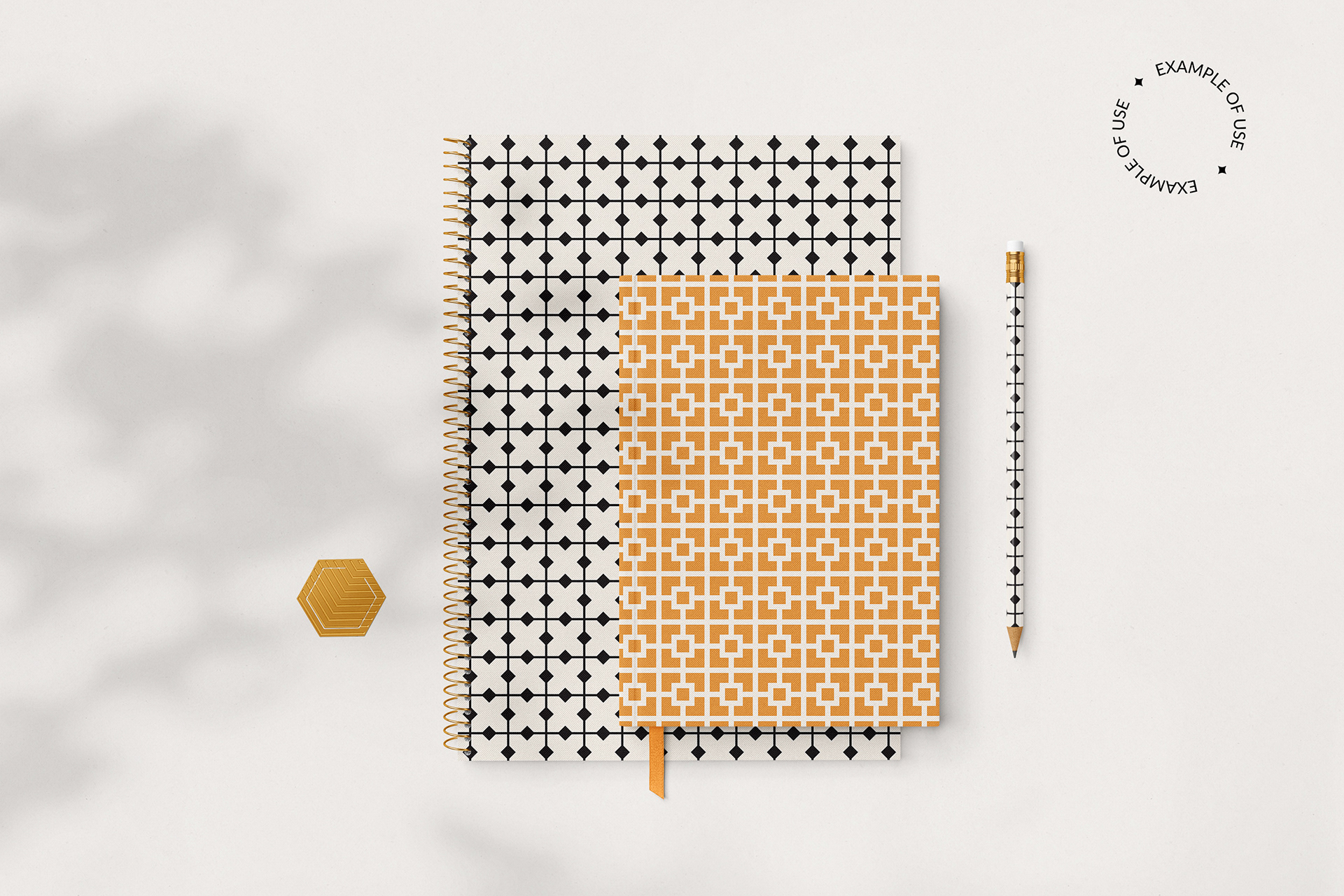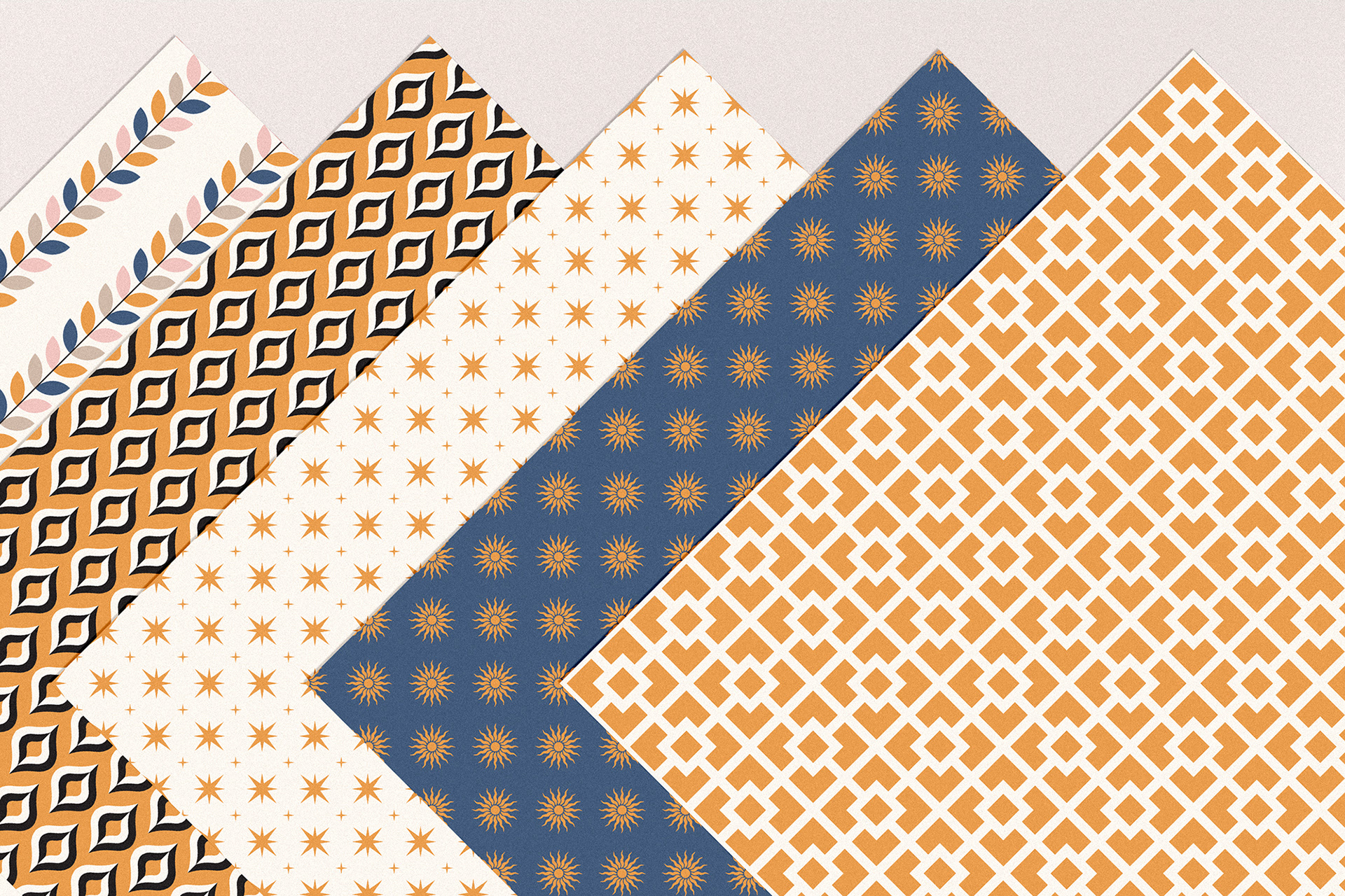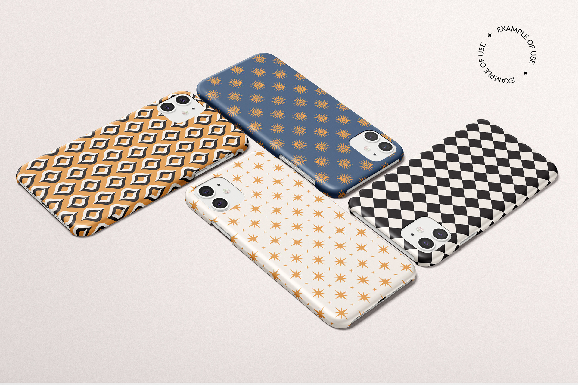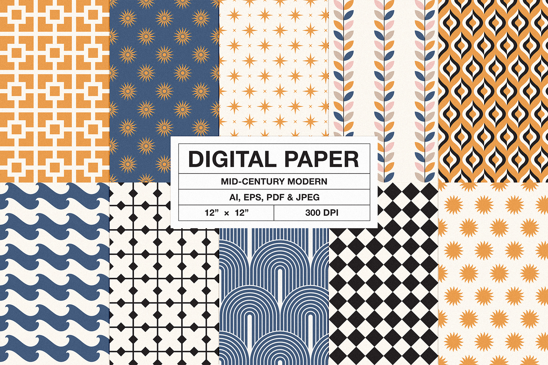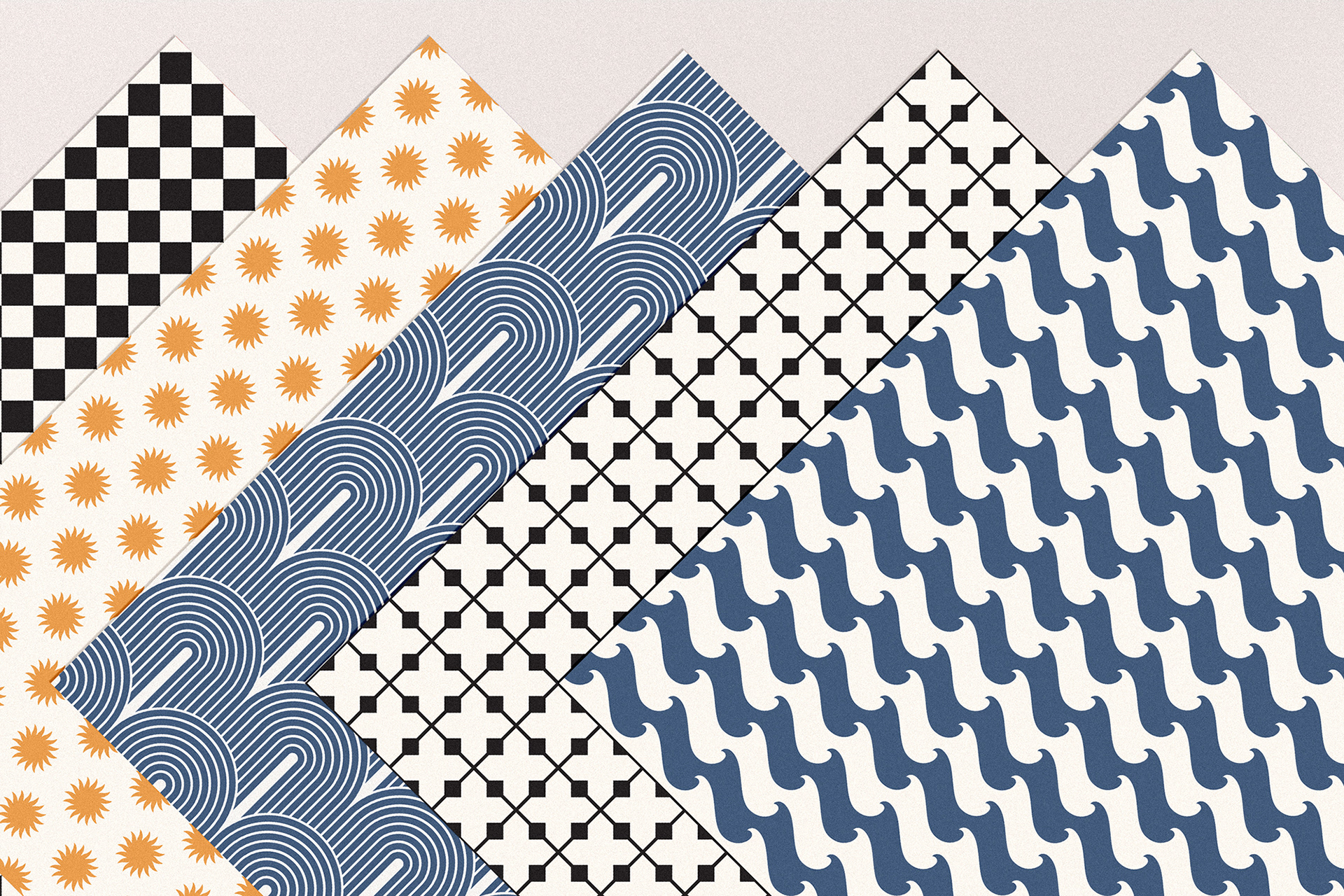 A set of seamless patterns inspired by the sleek geometry and cheerful spirit of 1950s design. Clean lines, retro tones, and playful symmetry capture the timeless charm of the mid-century era.