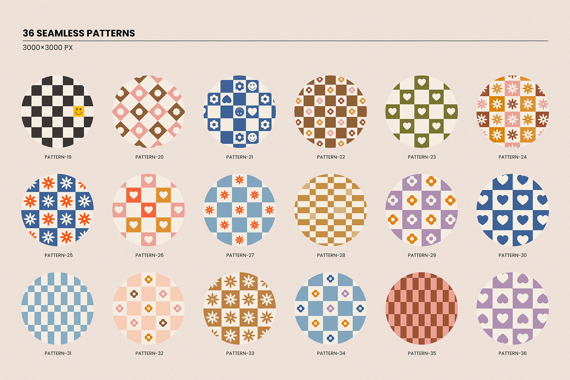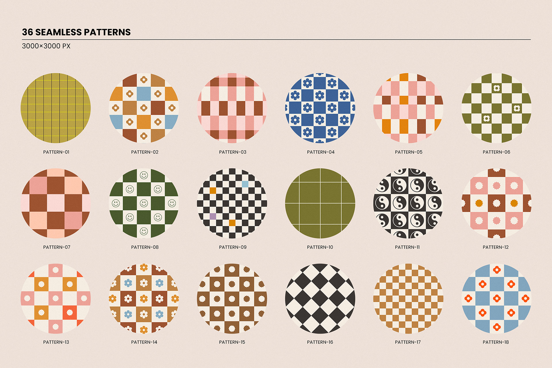 A playful collection of seamless designs blending the aesthetics of the 60s, 70s, and 90s. Bold checks, soft grids, and nostalgic color palettes come together to capture the charm of vintage-inspired graphics with a modern twist.