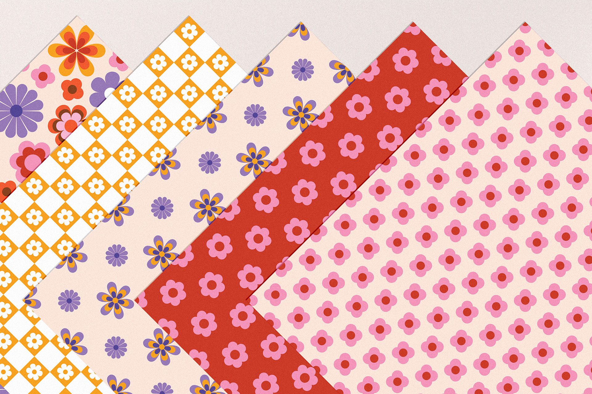 A vibrant collection of seamless patterns inspired by the carefree spirit of the 60s. Perfect for adding a touch of retro charm to any project — from stationery and invitations to wall art, branding, and creative collages.