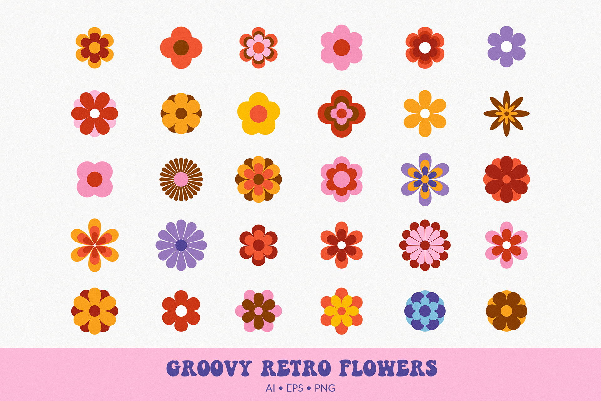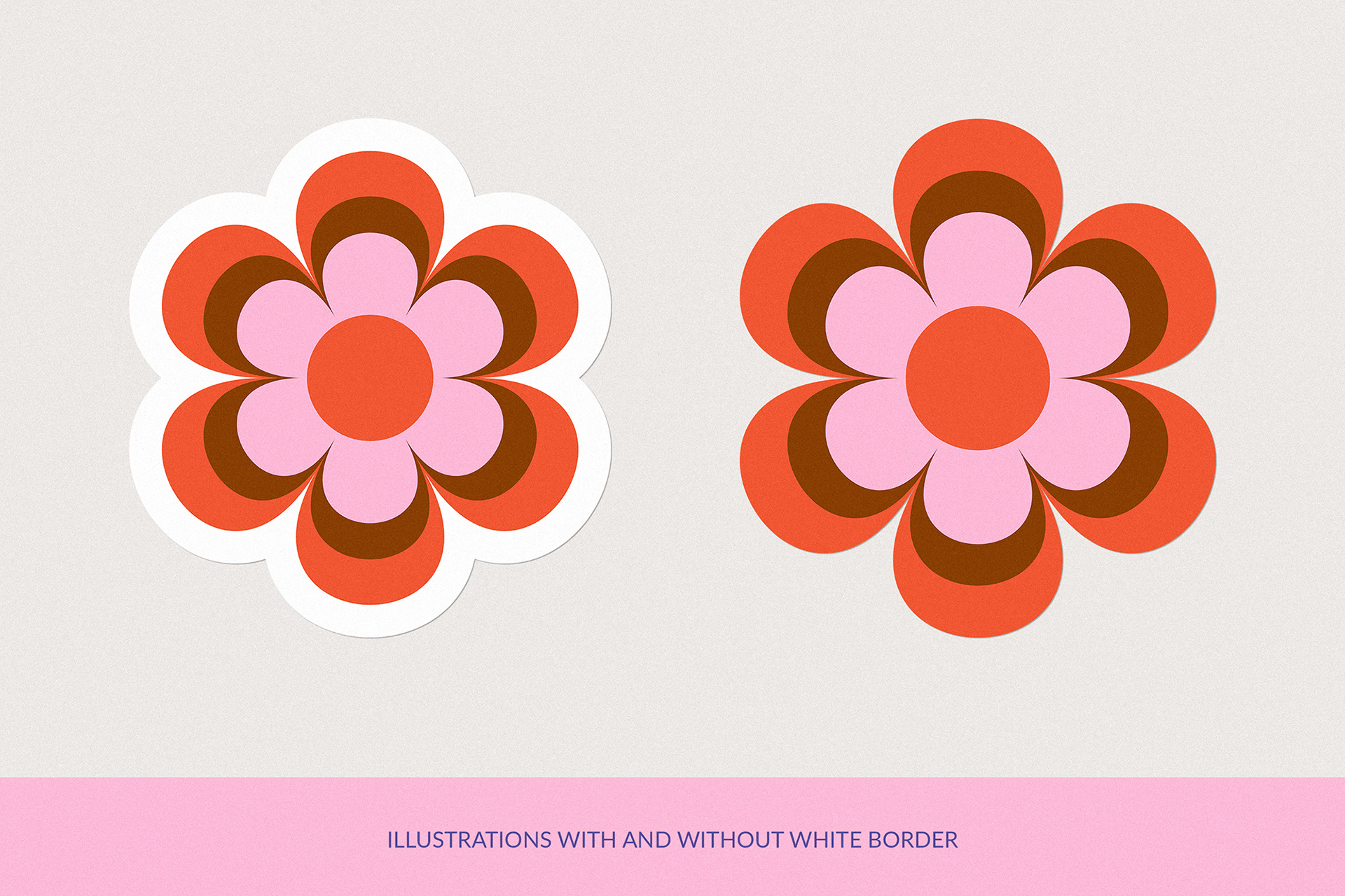 A playful set of 60sā70s inspired floral illustrations bursting with groovy charm. Perfect for adding a vintage, feel-good vibe to your designs ā from apparel and mugs to prints, stationery, and creative decor.