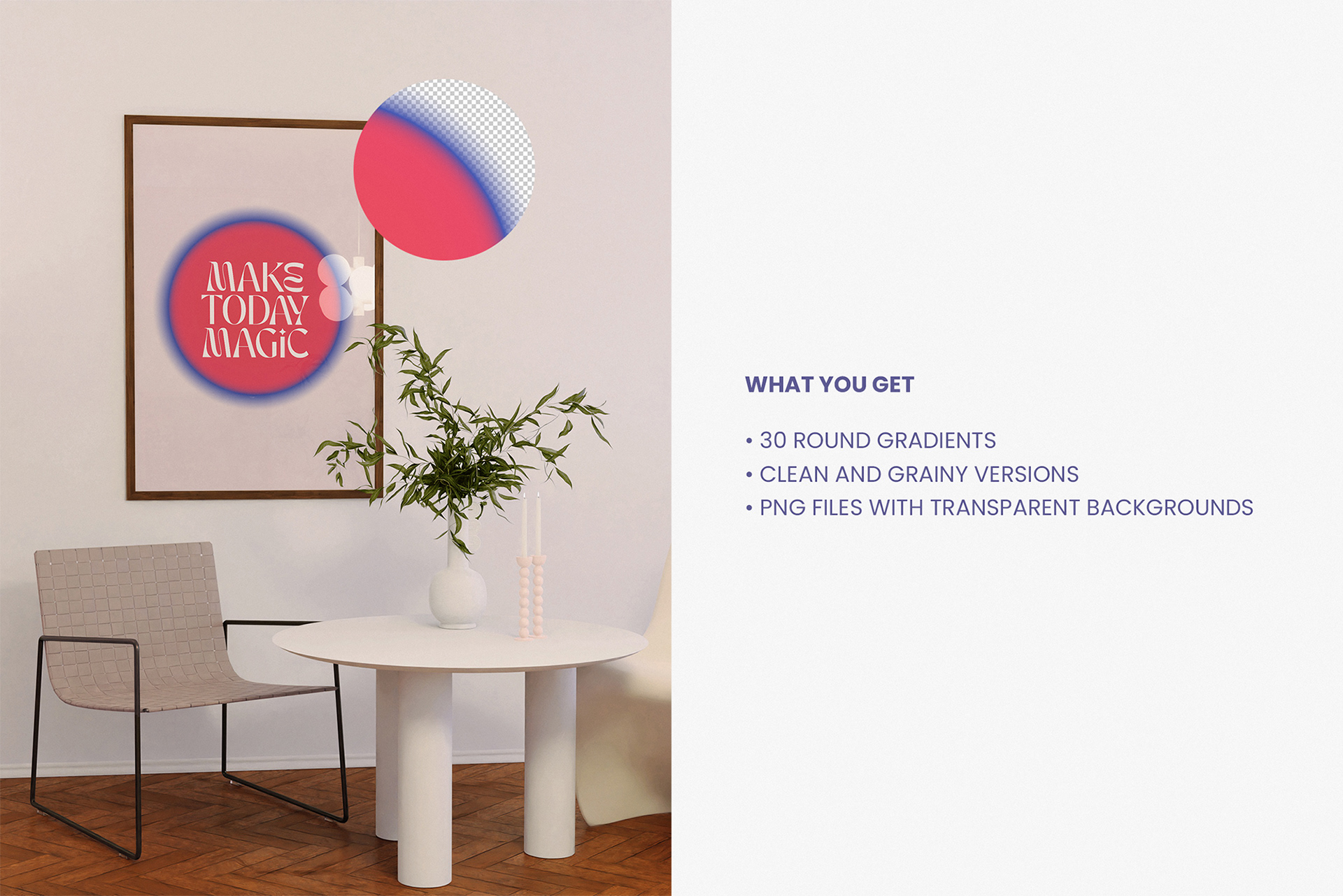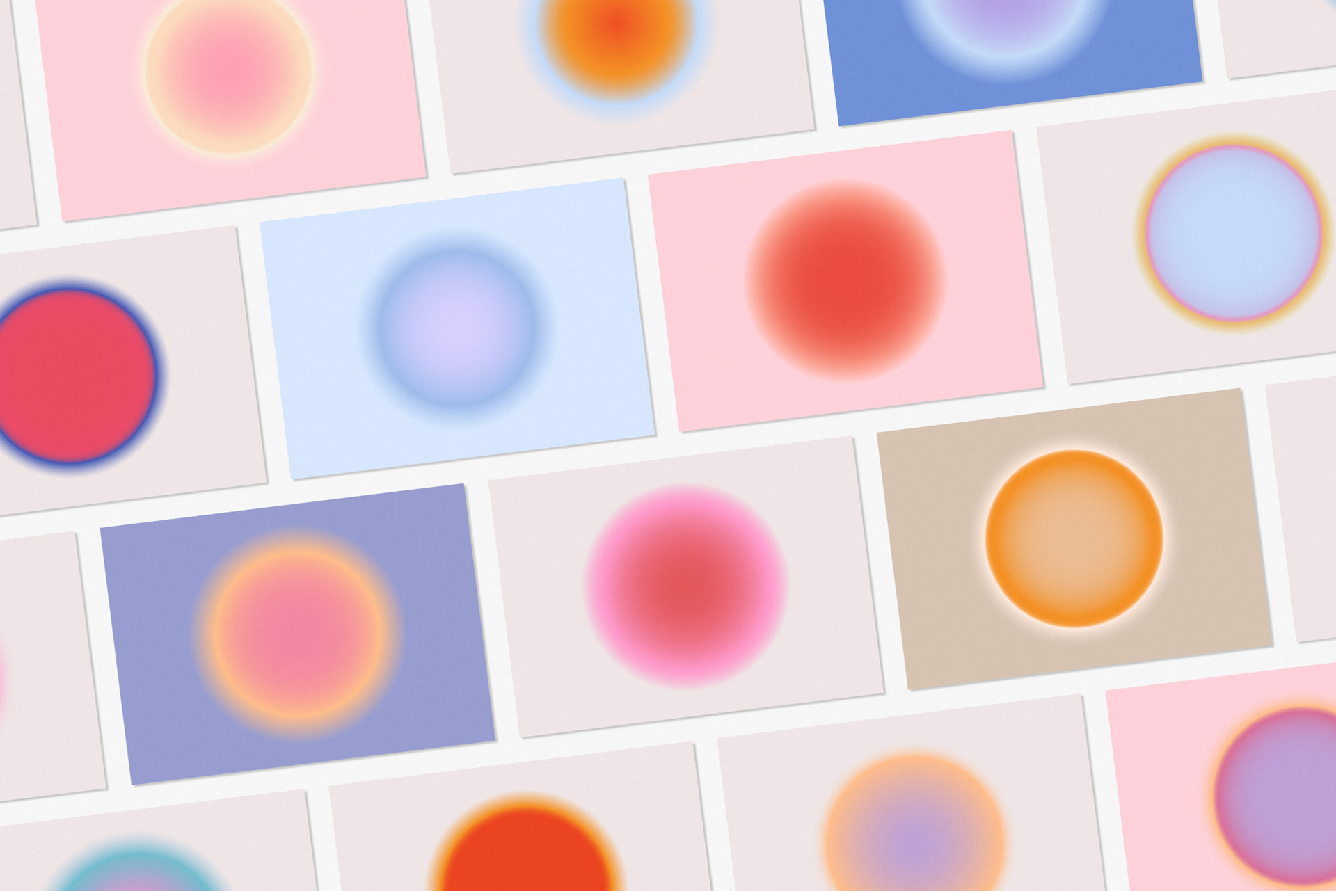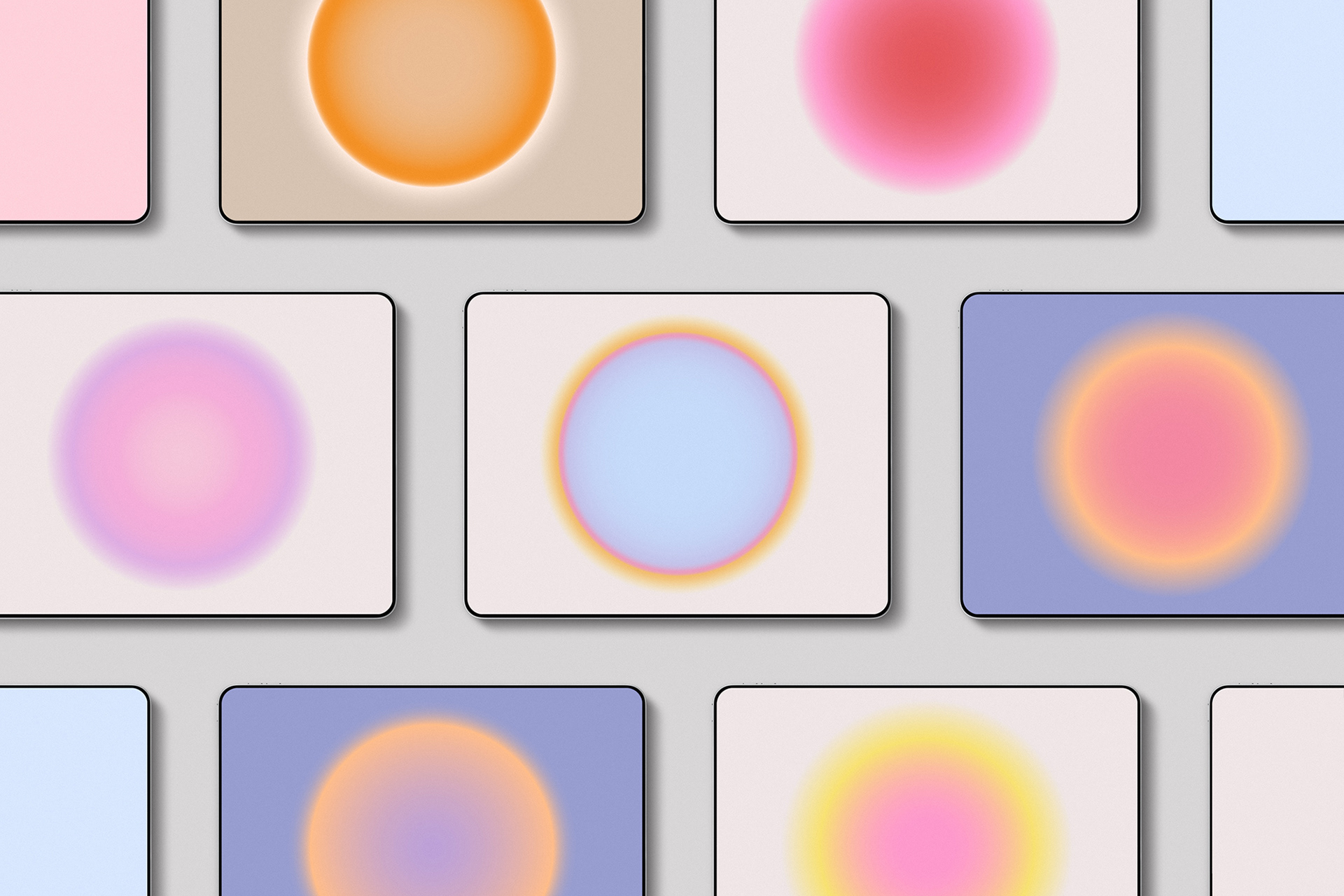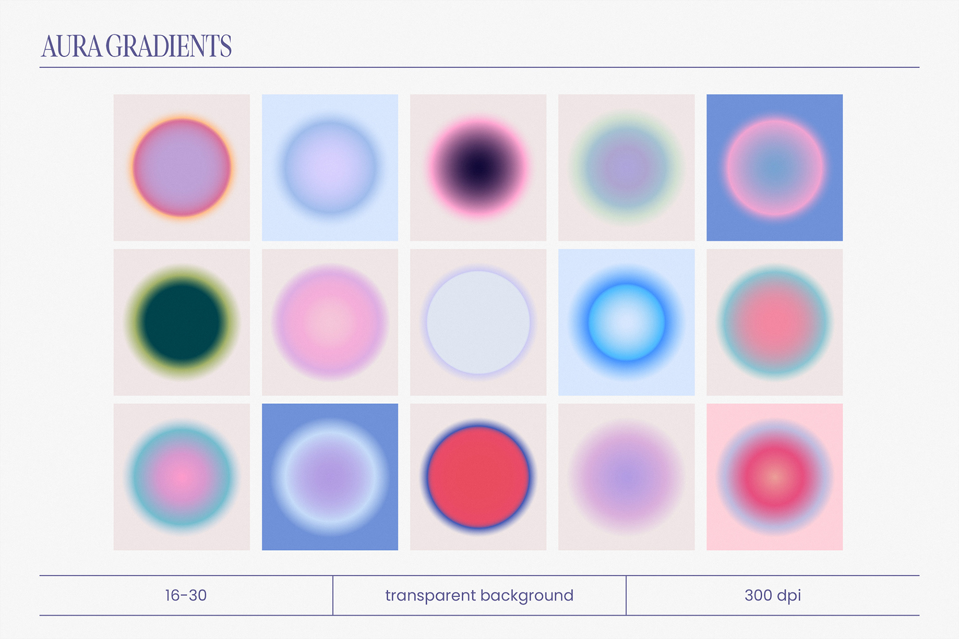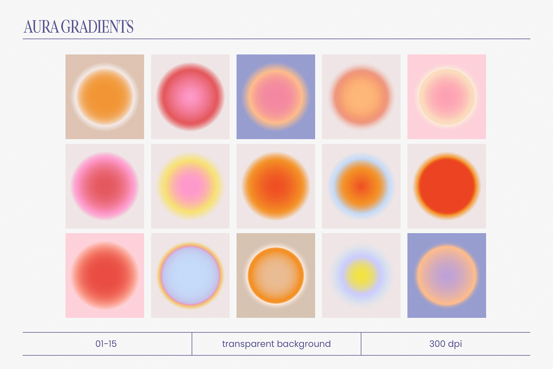 A collection of circular gradients inspired by aura colors and light diffusion. Designed in smooth and grainy variations, each shape captures a soft, glowing atmosphere ideal for contemporary visual design.