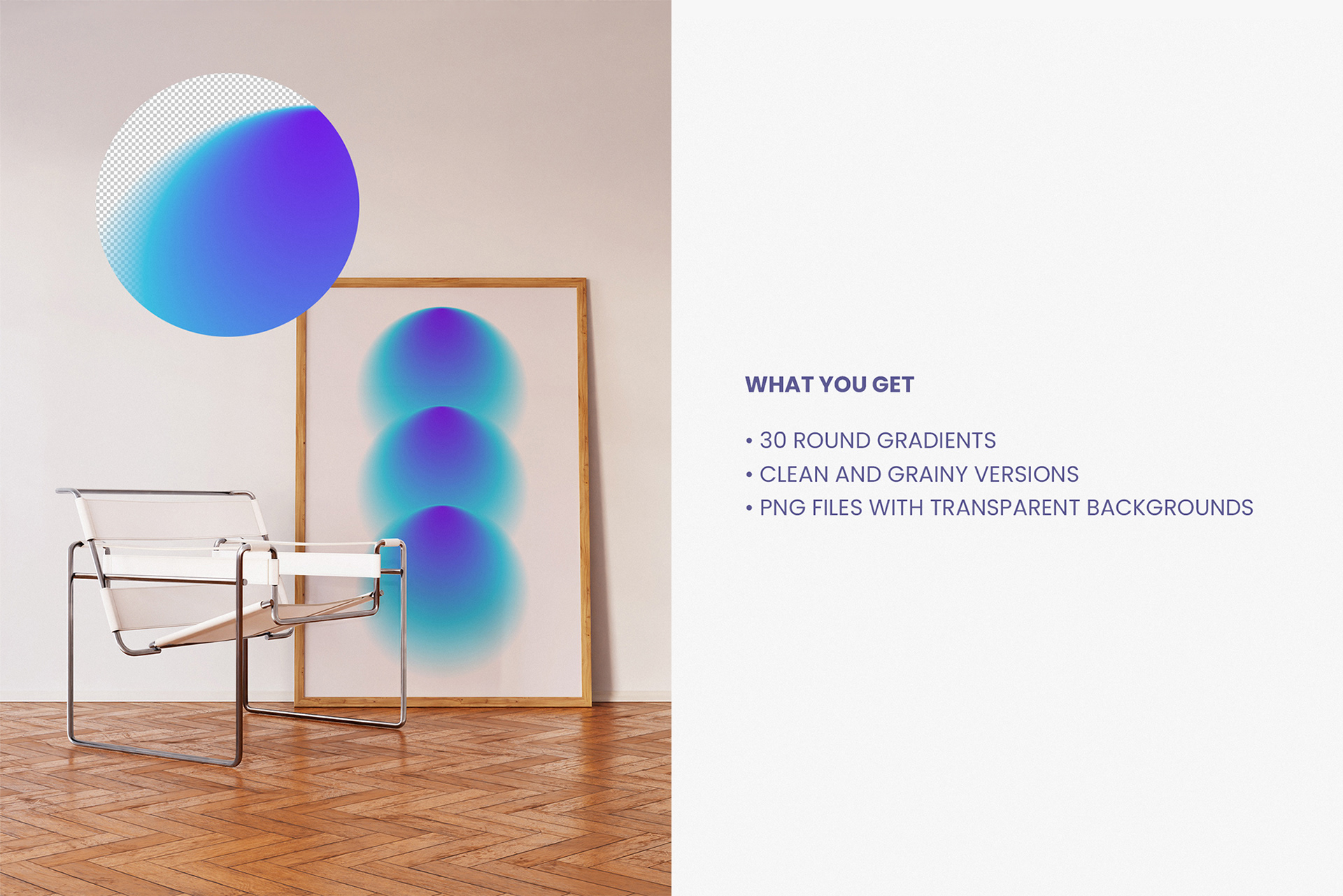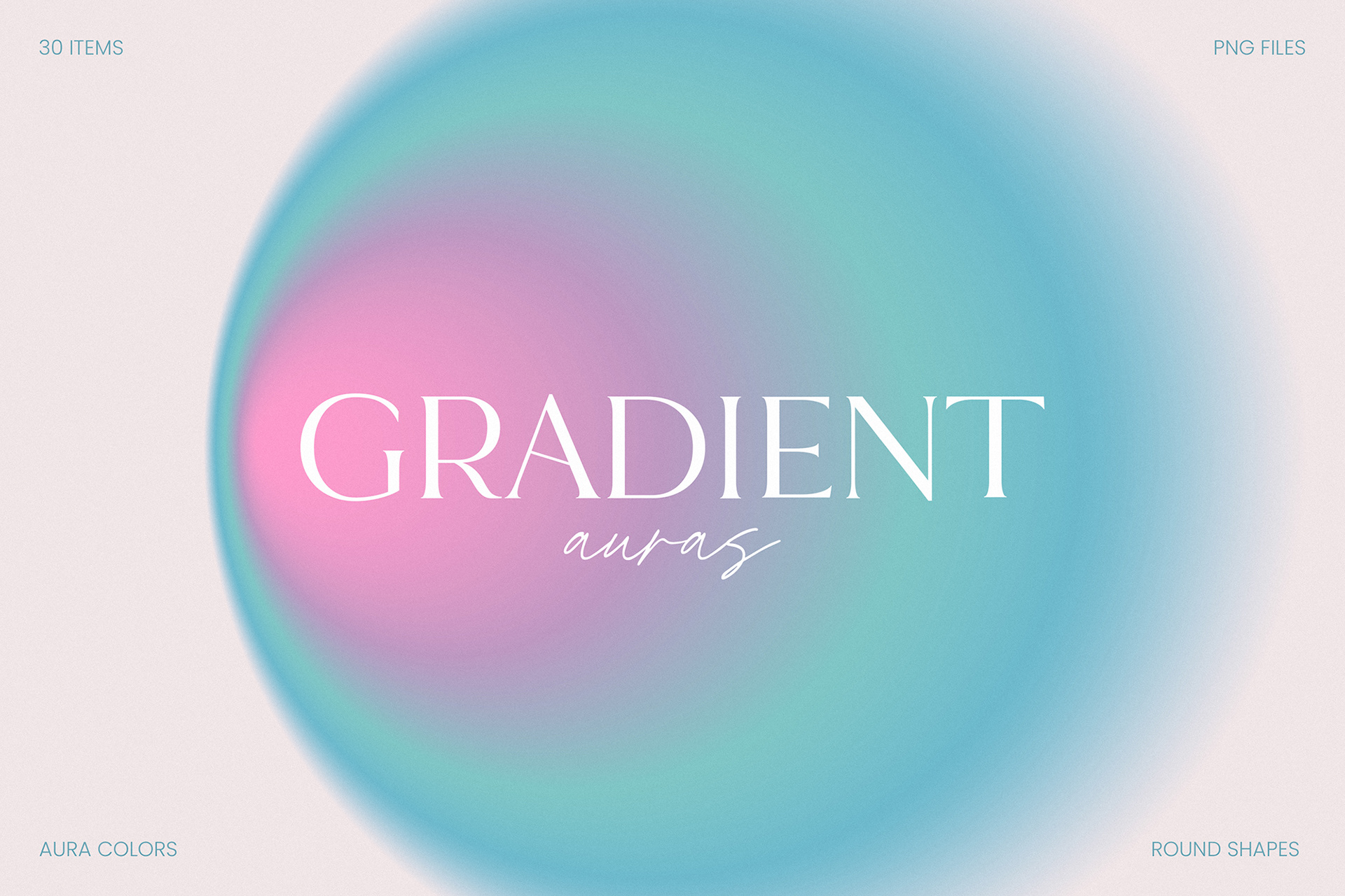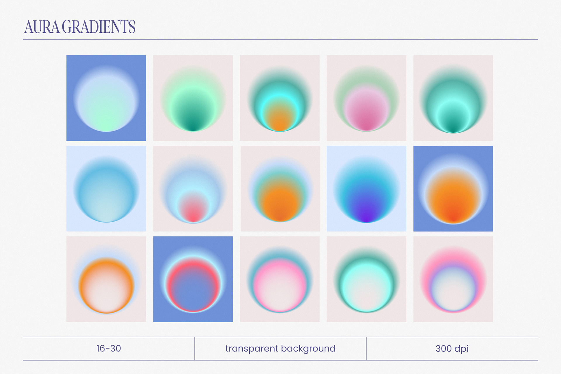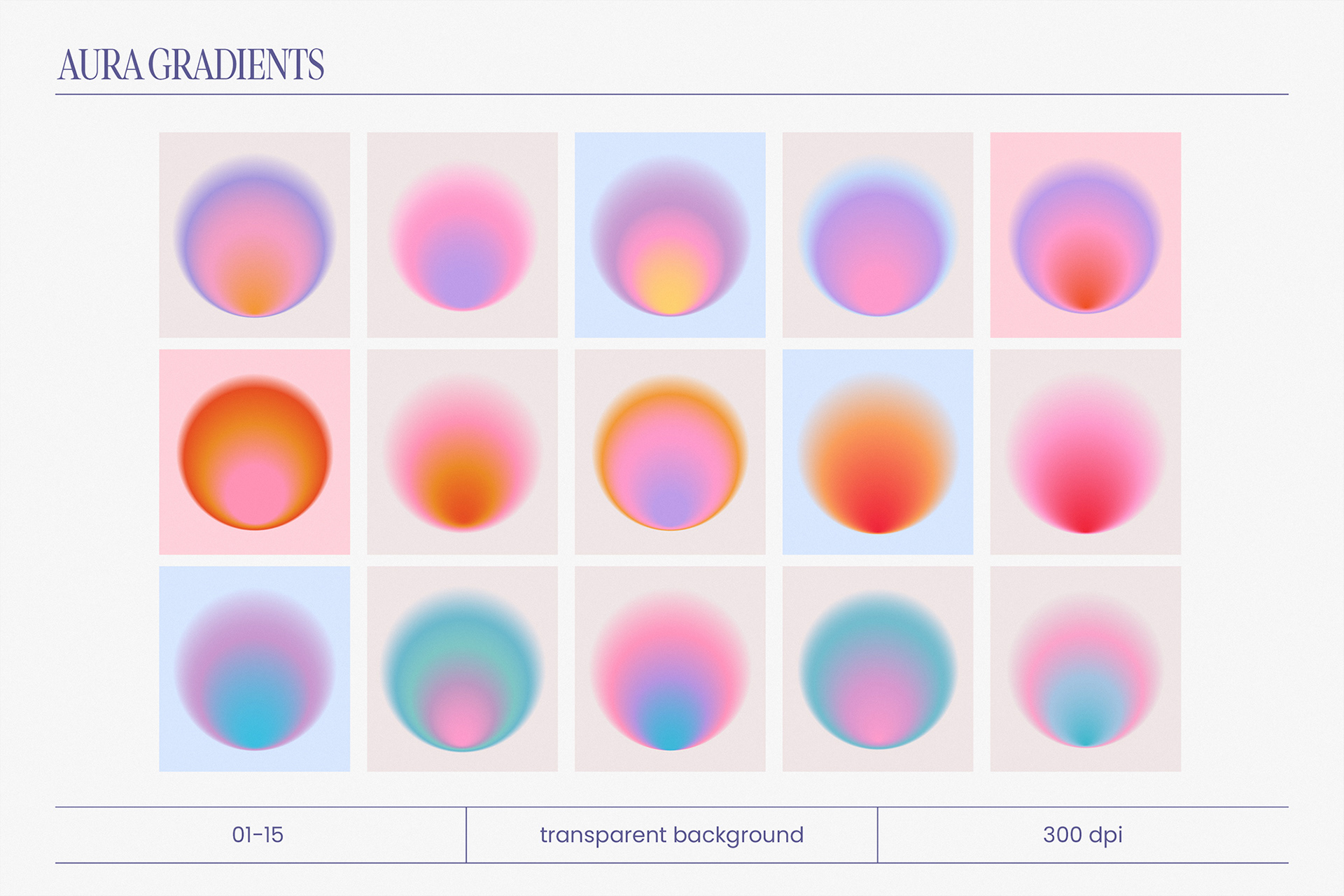 A collection of circular gradient shapes inspired by the colors and flow of auras. Each piece blends soft transitions and glowing tones, designed to add a modern, ethereal touch to visual compositions.
