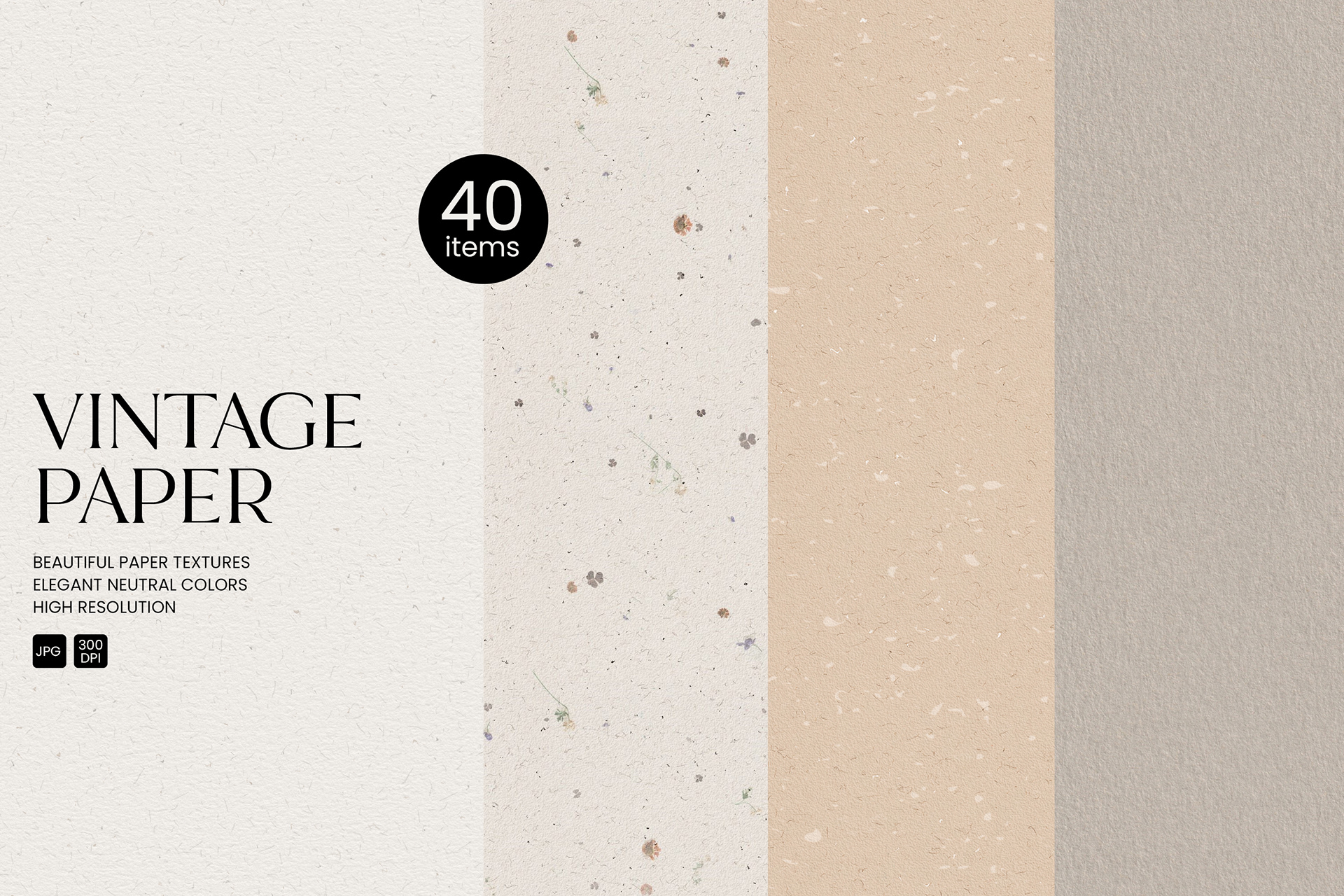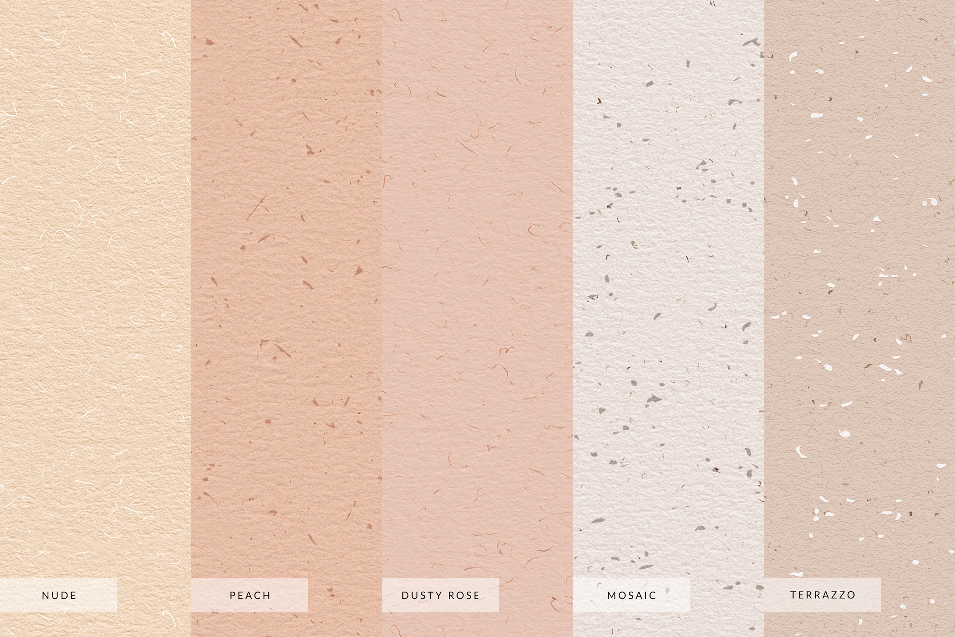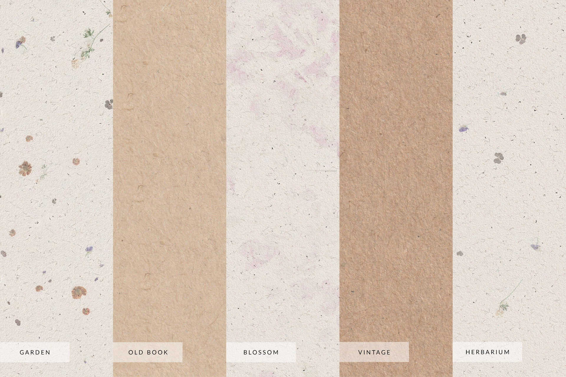 A series of handmade and digital paper textures featuring subtle fibers, metallic flakes, and dried floral details. Created in soft neutral tones that reflect natural elegance and timeless simplicity.
