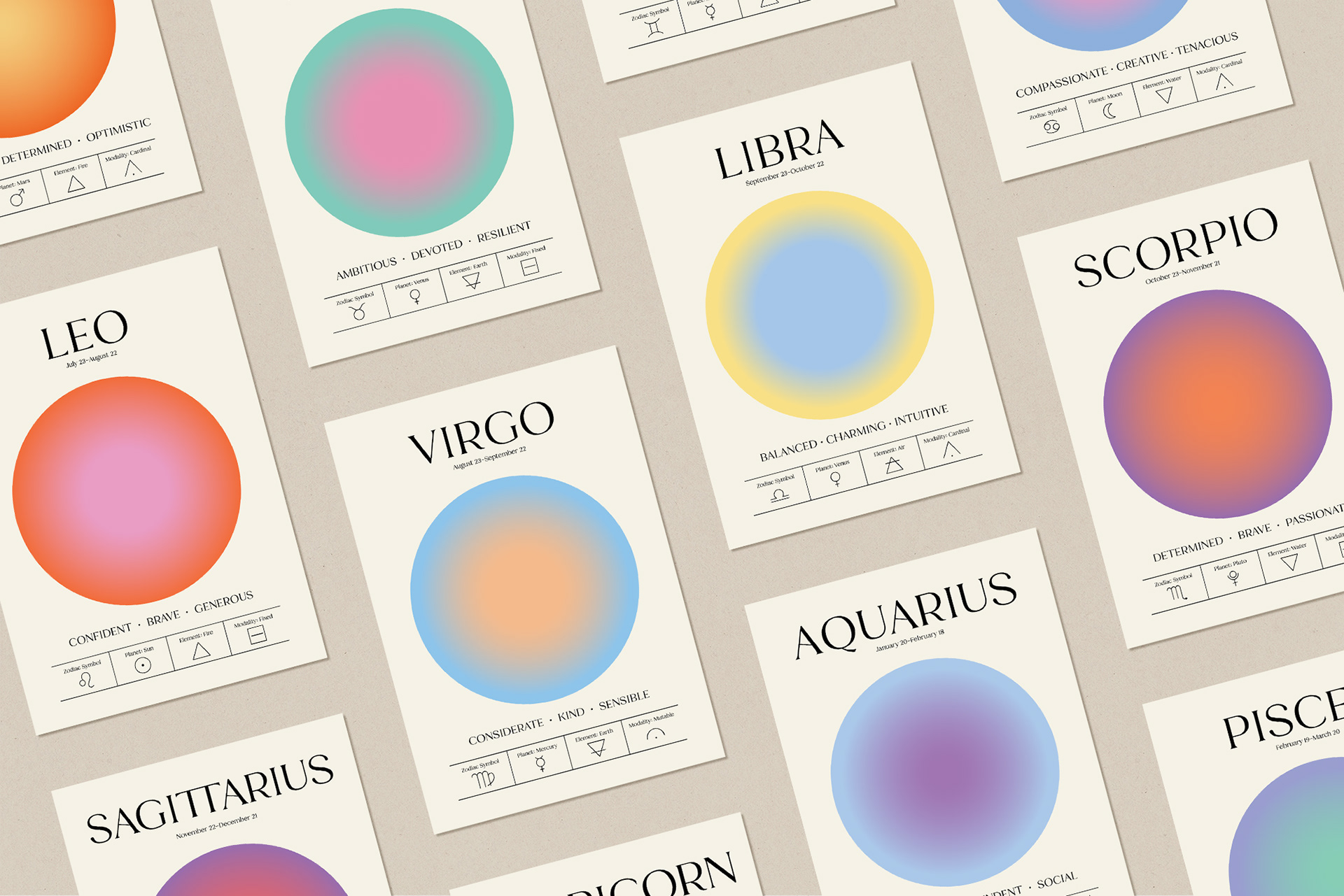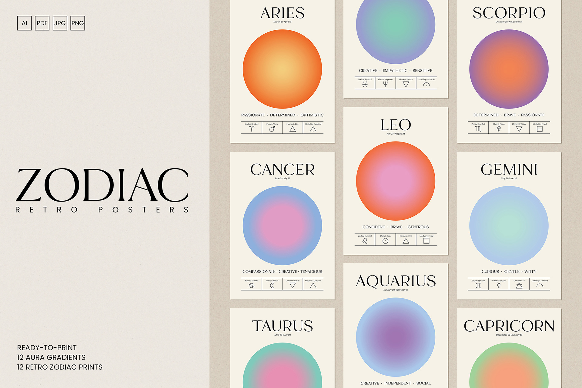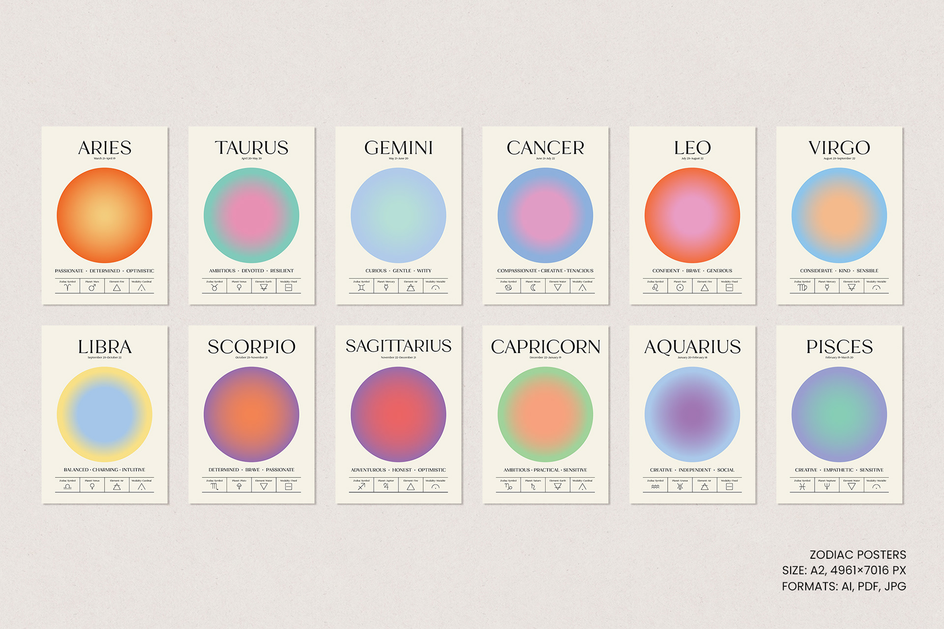 A retro-inspired astrology collection combining clean typography with soft aura gradients. Each poster reflects the mood and energy of its zodiac sign, blending vintage design with a modern spiritual aesthetic.