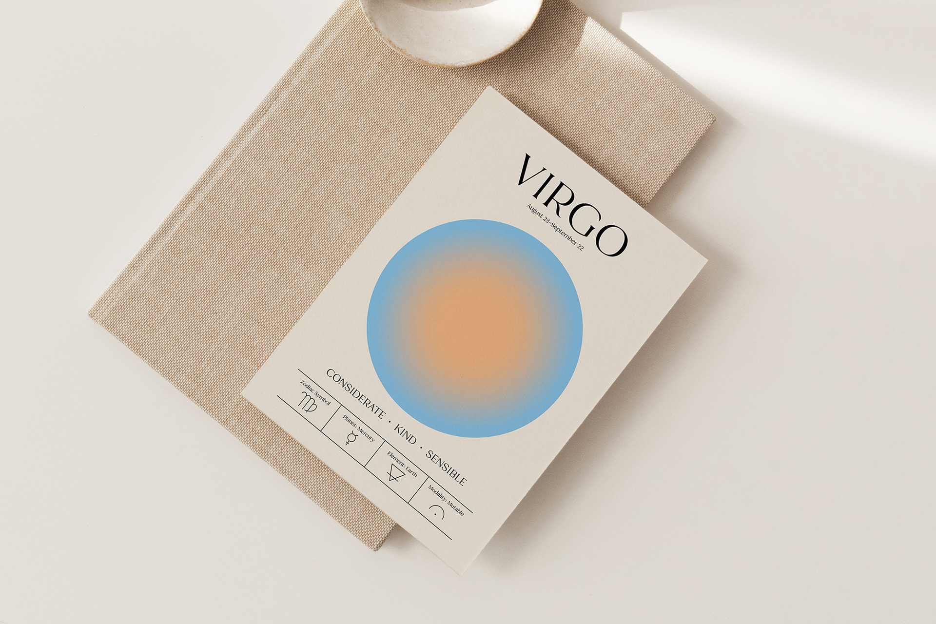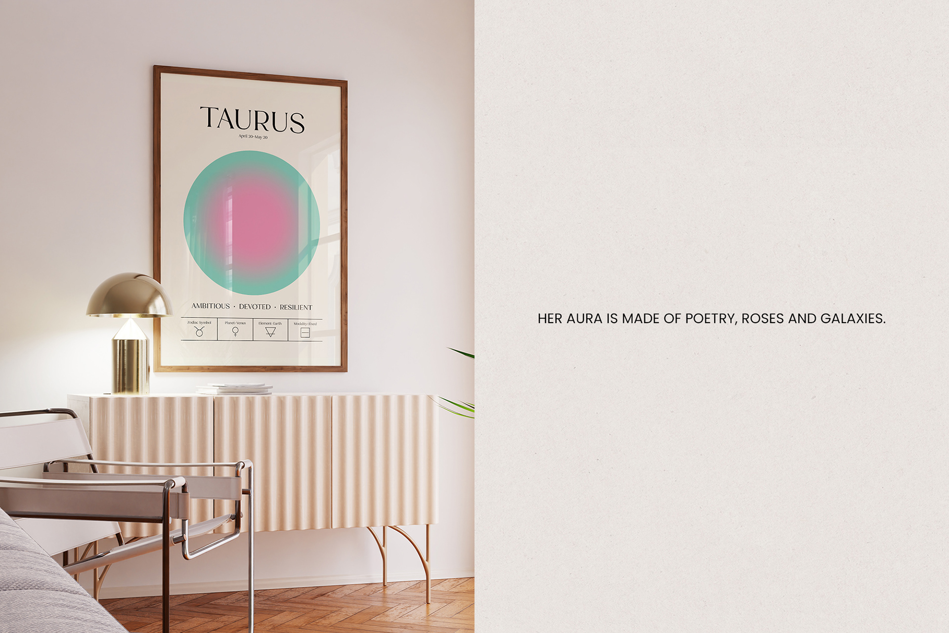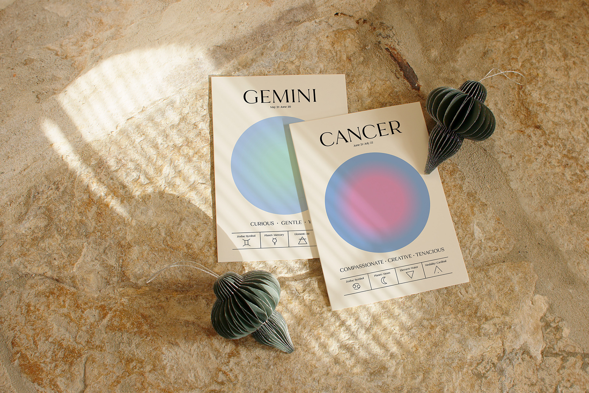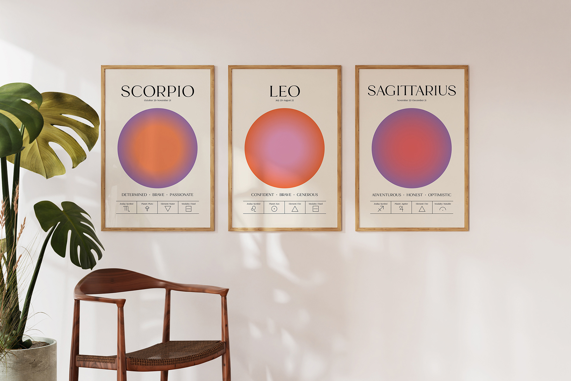 A retro-inspired astrology collection combining clean typography with soft aura gradients. Each poster reflects the mood and energy of its zodiac sign, blending vintage design with a modern spiritual aesthetic.