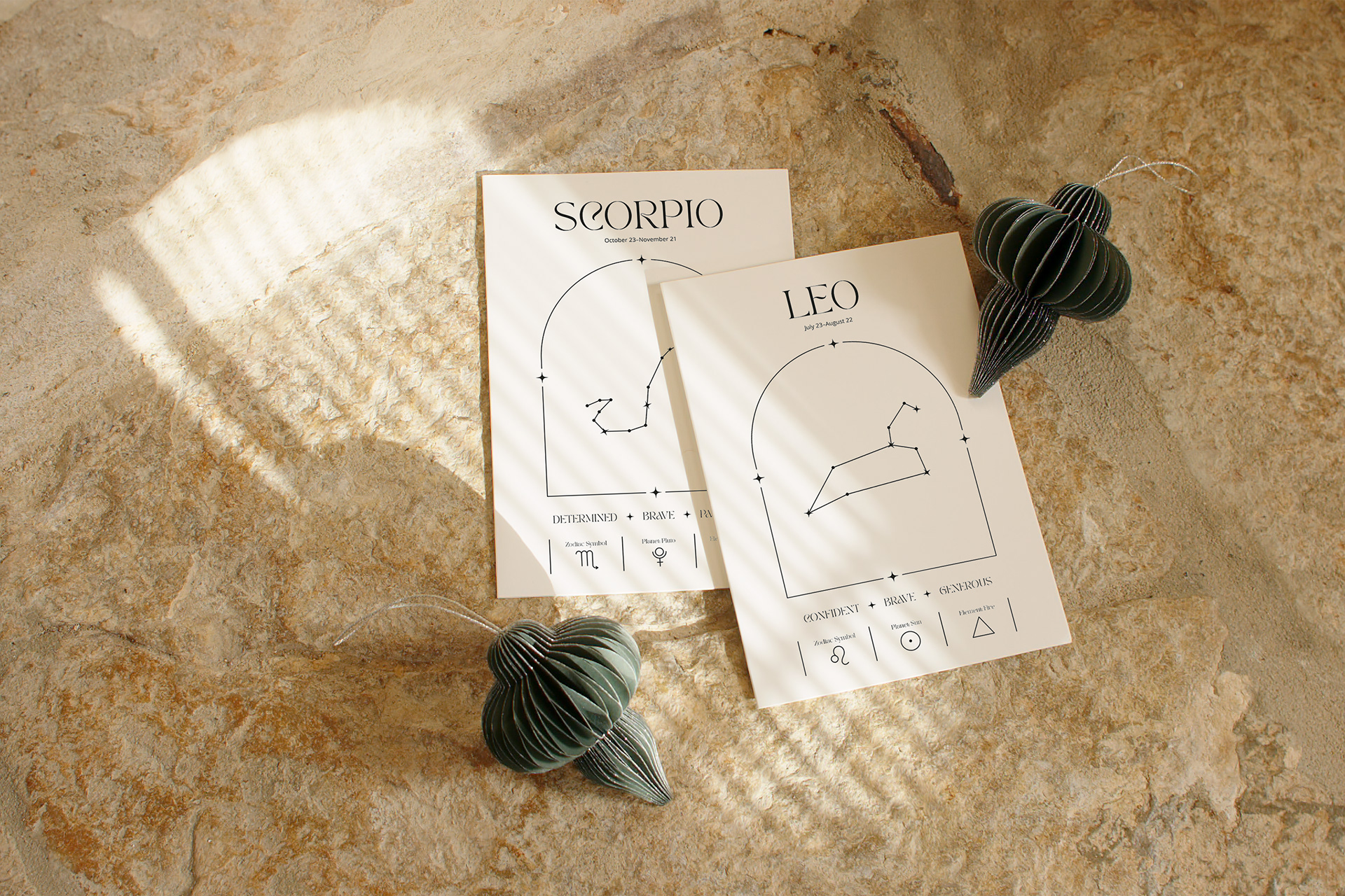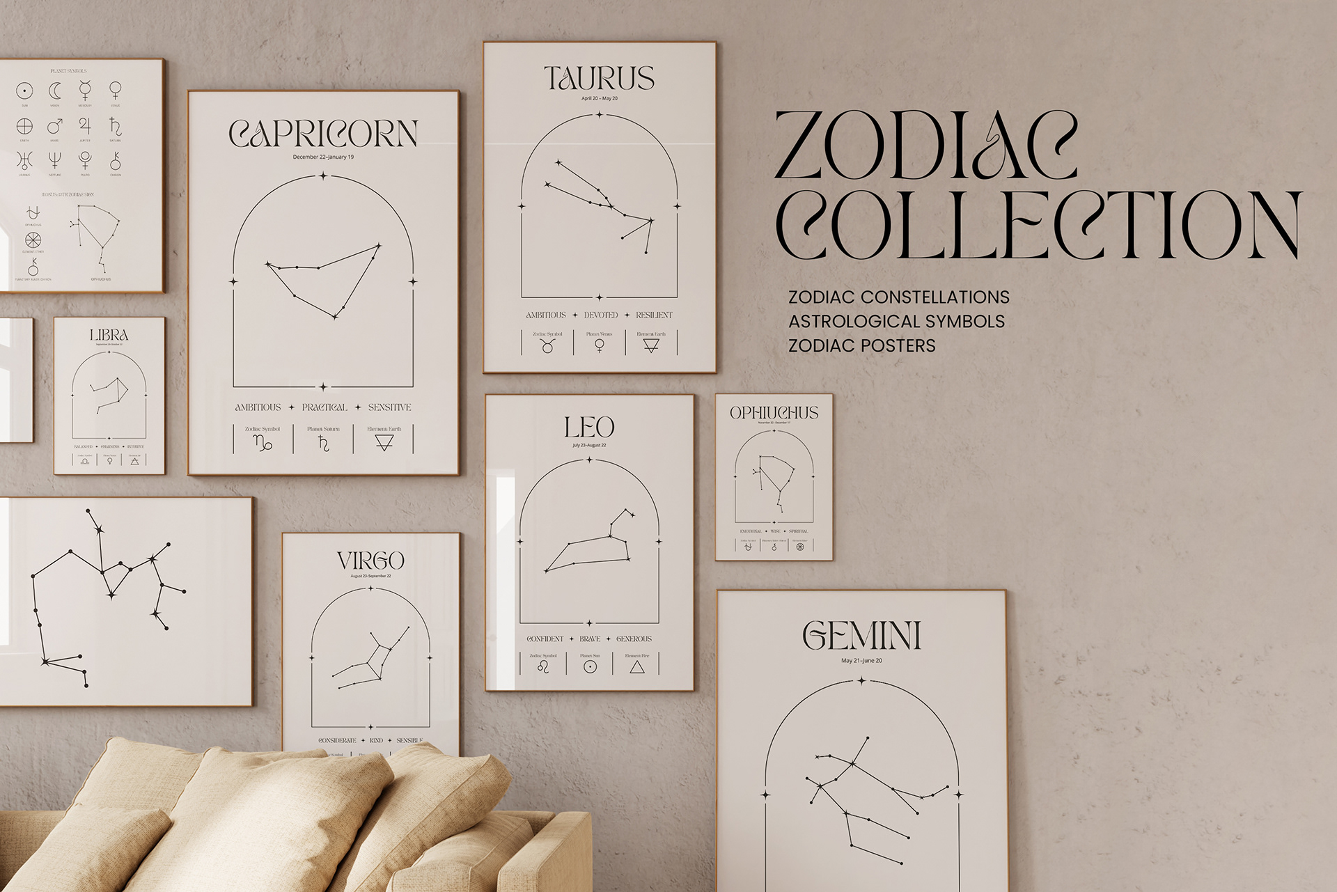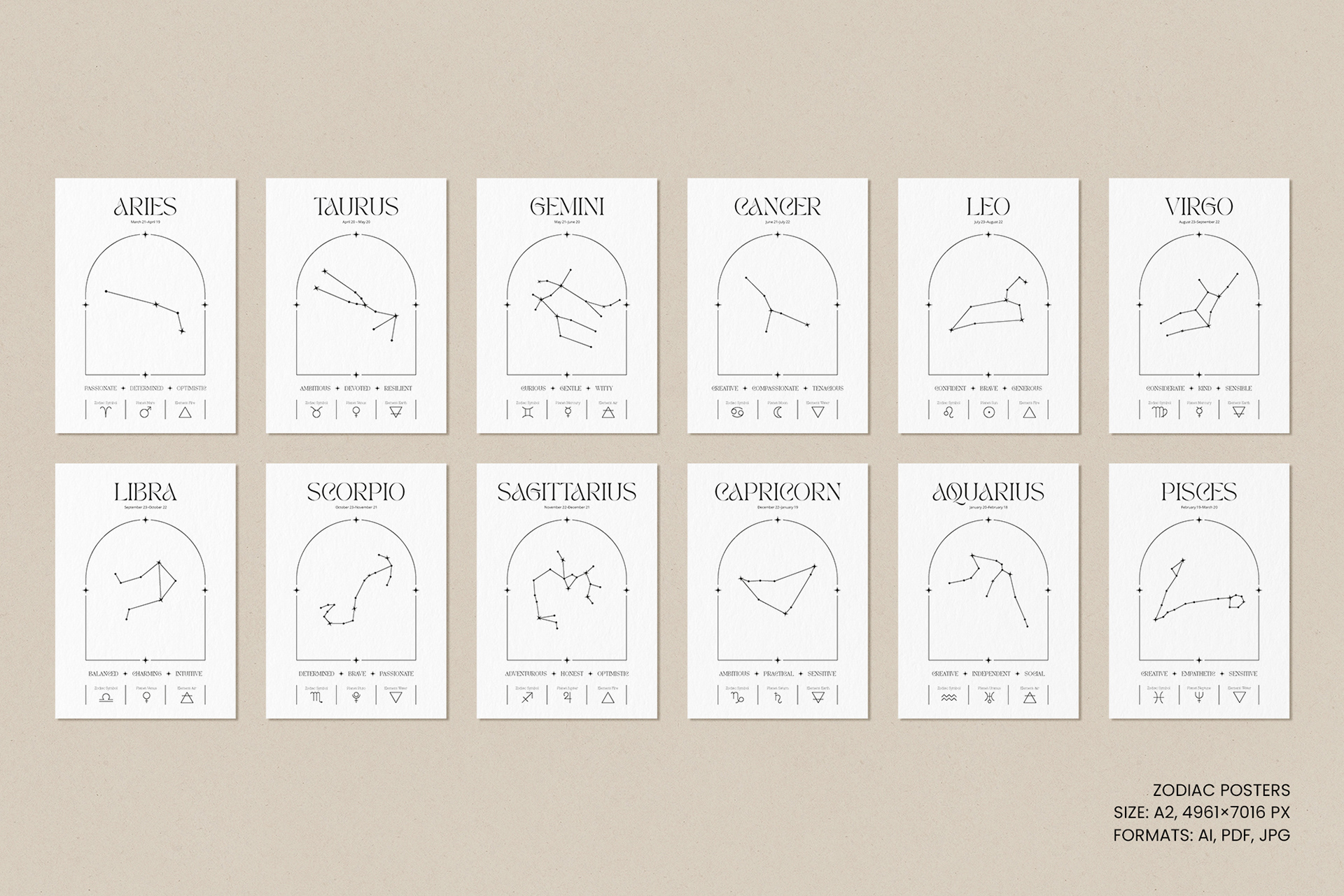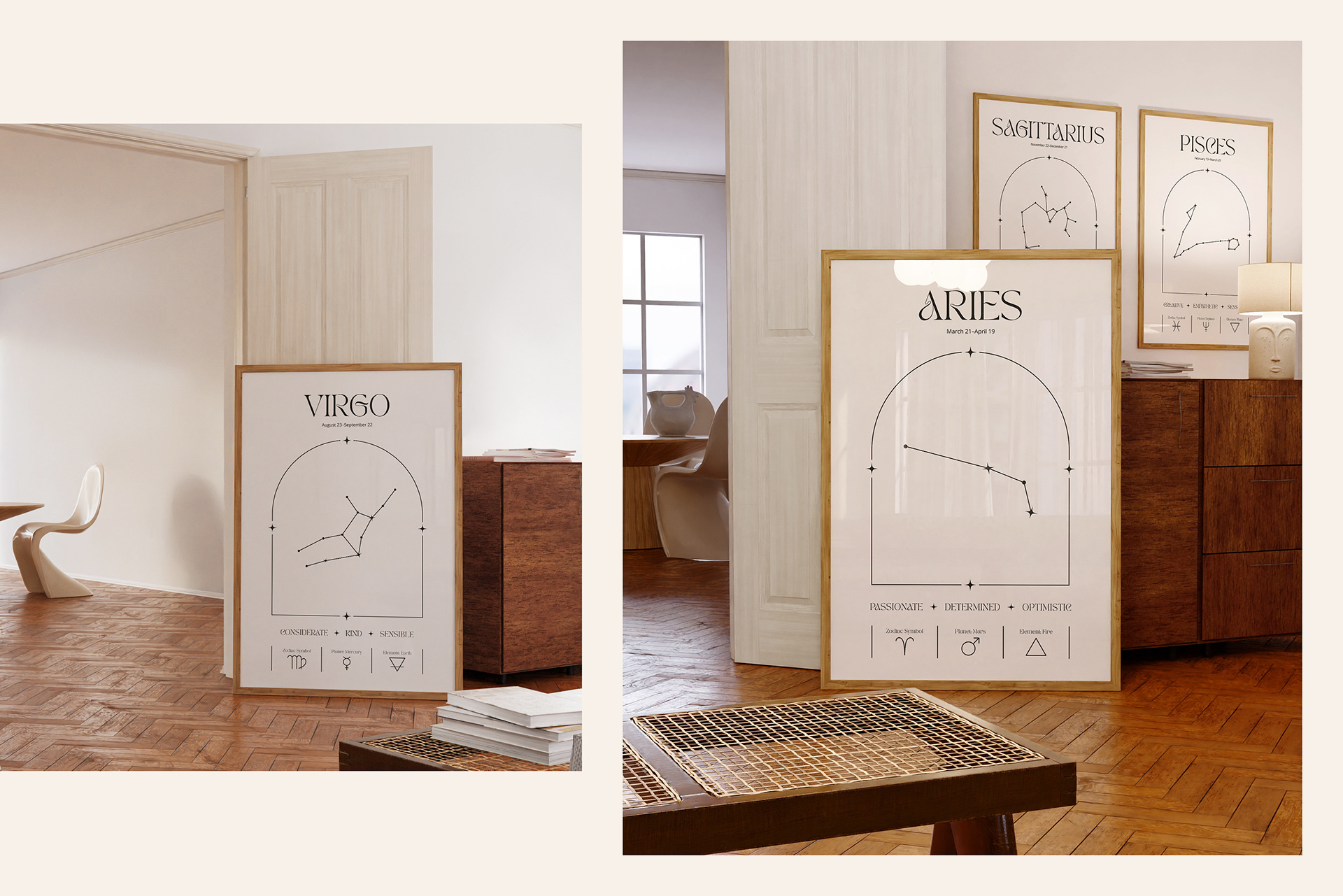 A clean, modern take on astrology inspired by retro prints and timeless symbolism. The collection combines celestial motifs and minimalist lines to create a balanced aesthetic — elegant, versatile, and perfect for contemporary design.
