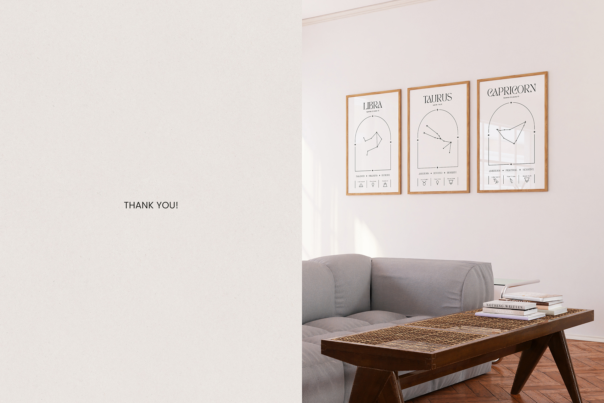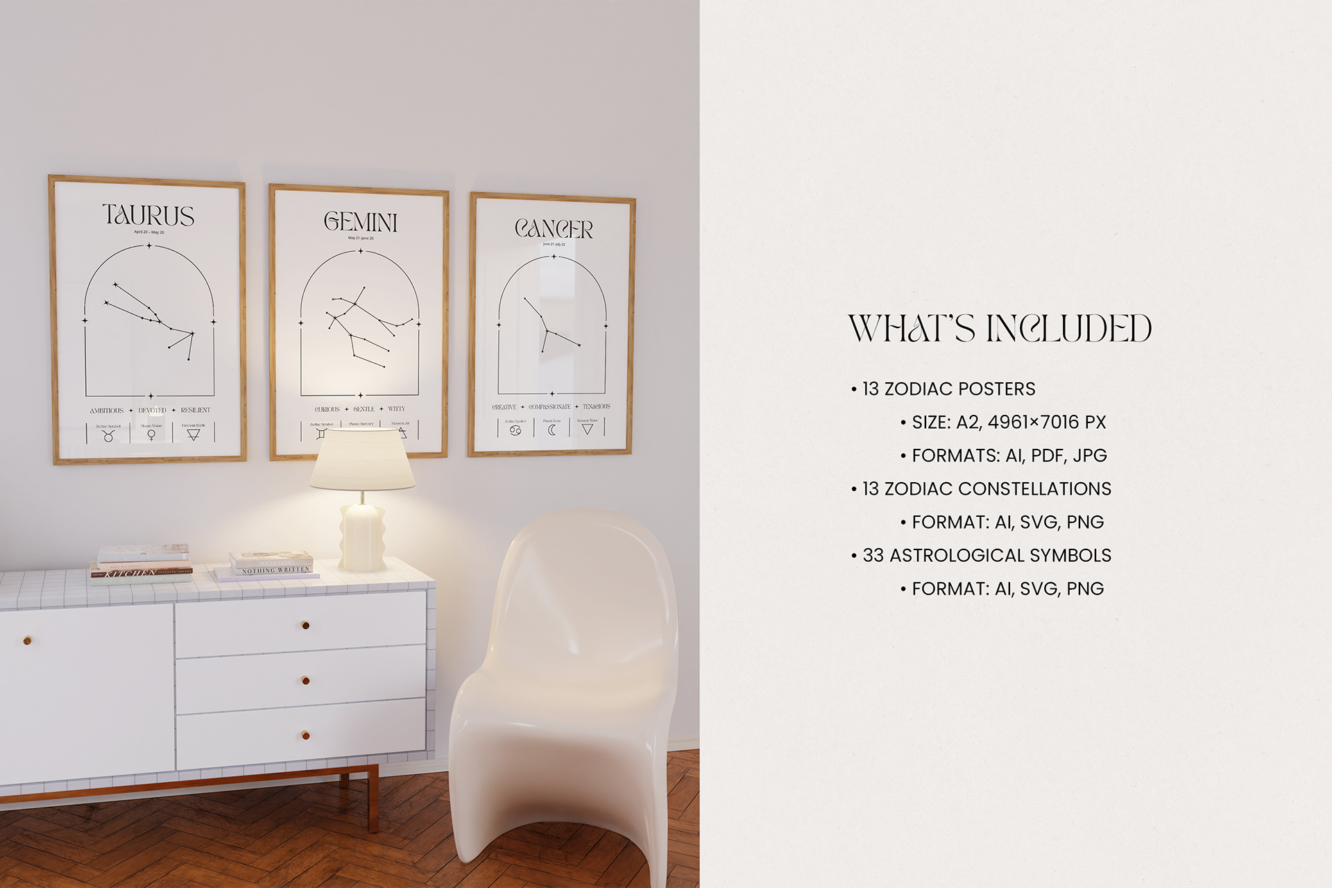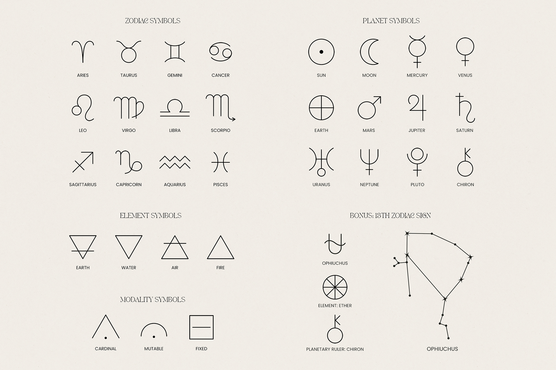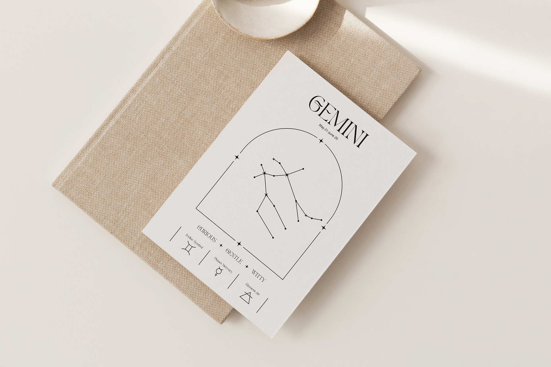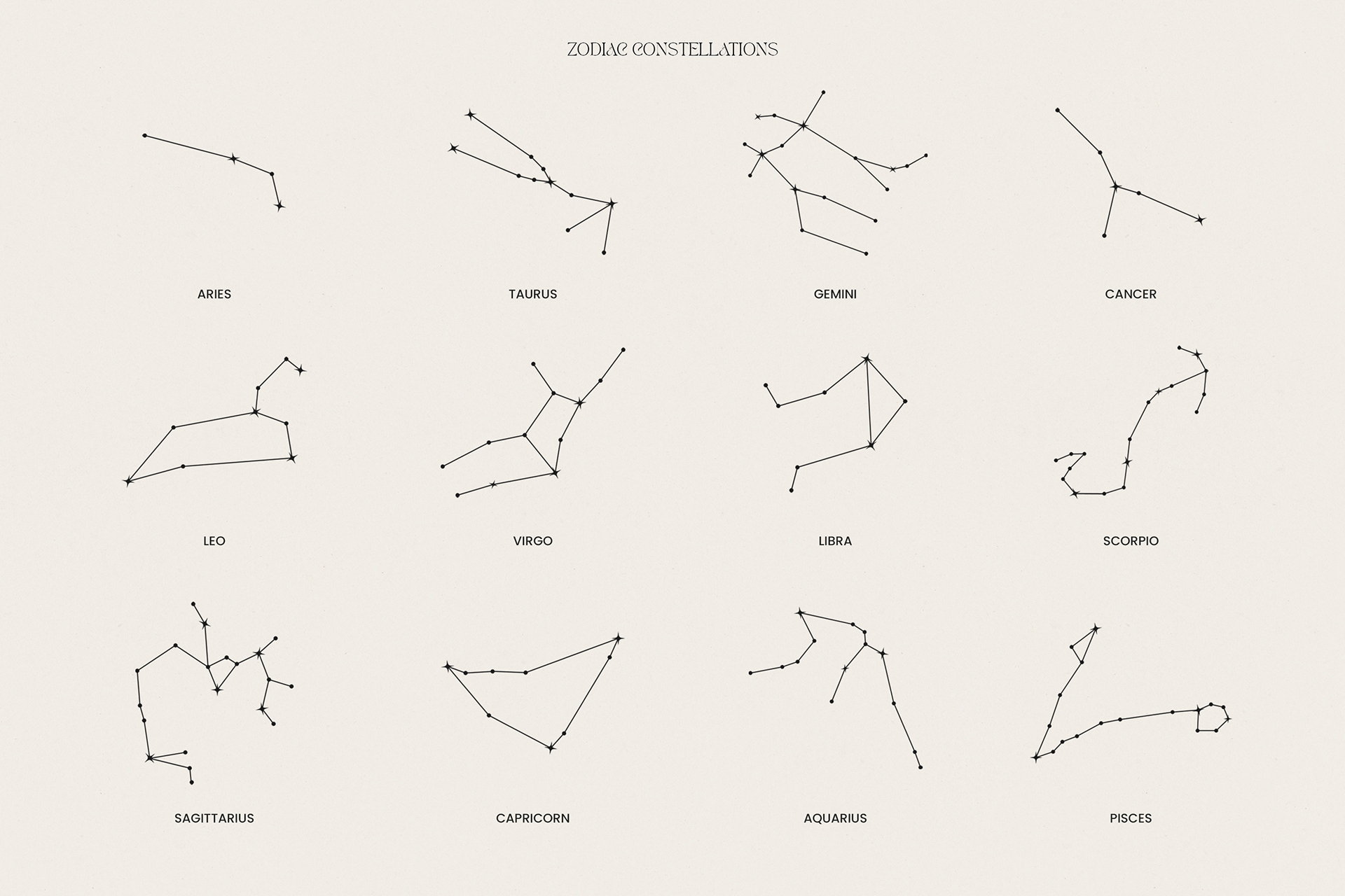 A clean, modern take on astrology inspired by retro prints and timeless symbolism. The collection combines celestial motifs and minimalist lines to create a balanced aesthetic — elegant, versatile, and perfect for contemporary design.